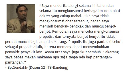 • Tahun 1968, seseorang peneliti Perancis bernama Dr.Remy Chauvint mengesahkan jika : Propolis memiliki kandungan mineral serta vitamin lengkap, adalah “antibiotik” alami, 100 persen bisa membunuh bakteri serta virus dan tidak ada resikonya dari pemakaiannya.